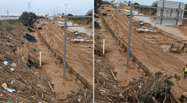 Así se encontraba el Barranco de Torrent el día después de la tragedia, se ven restos de coches que parecen desguazados, da miedo pensar si había personas en su interior.