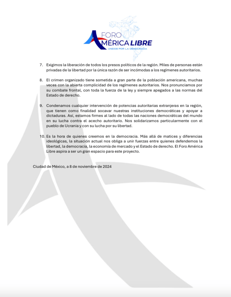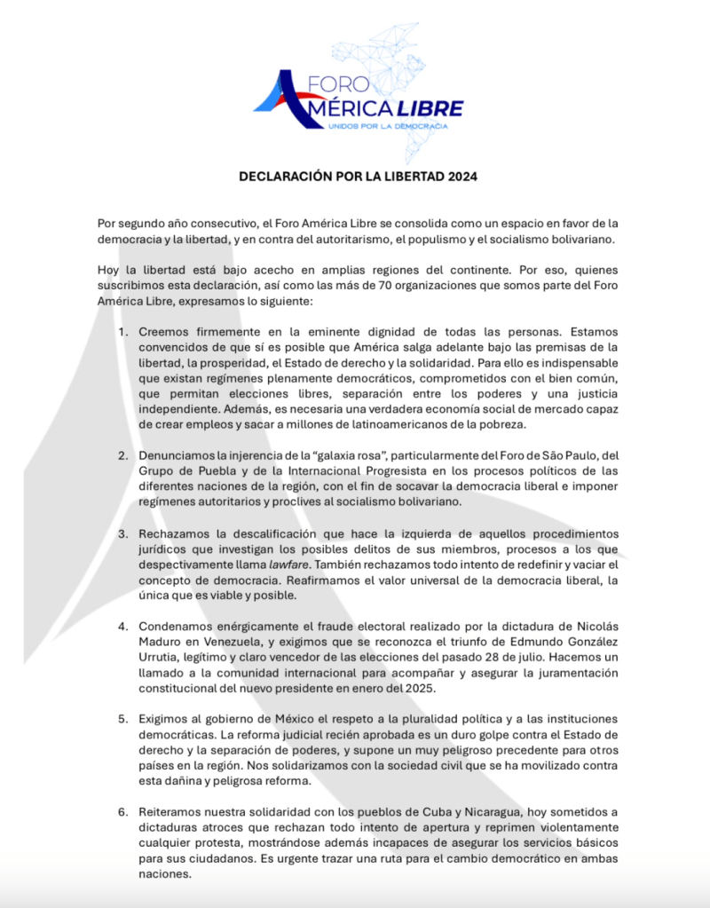 A continuación, el texto de la Declaración por la Libertad surgida del Foro América 2024, que se lleva a cabo en la Ciudad de México del 6 al 9 de noviembre.