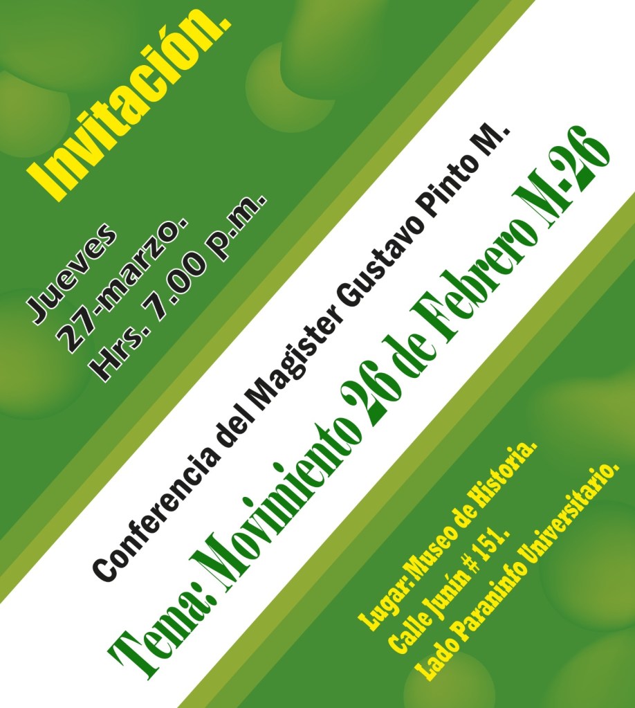 El jueves 27 de marzo, a partir de las 19:00 horas, Gustavo Pinto M. brindará una conferencia sobre el M-26 en el Museo de Historia (casona de la calle Junín, al lado del Paraninfo Universitario, Santa Cruz de la Sierra, Bolivia). El ingreso es abierto y gratuito.