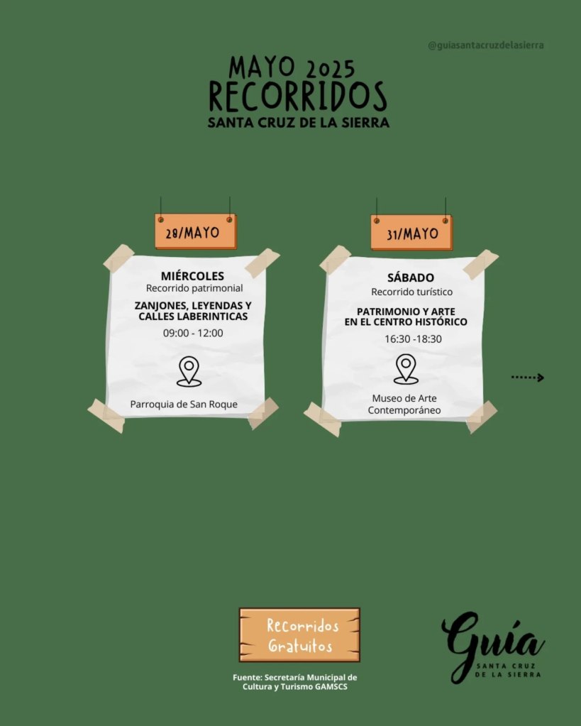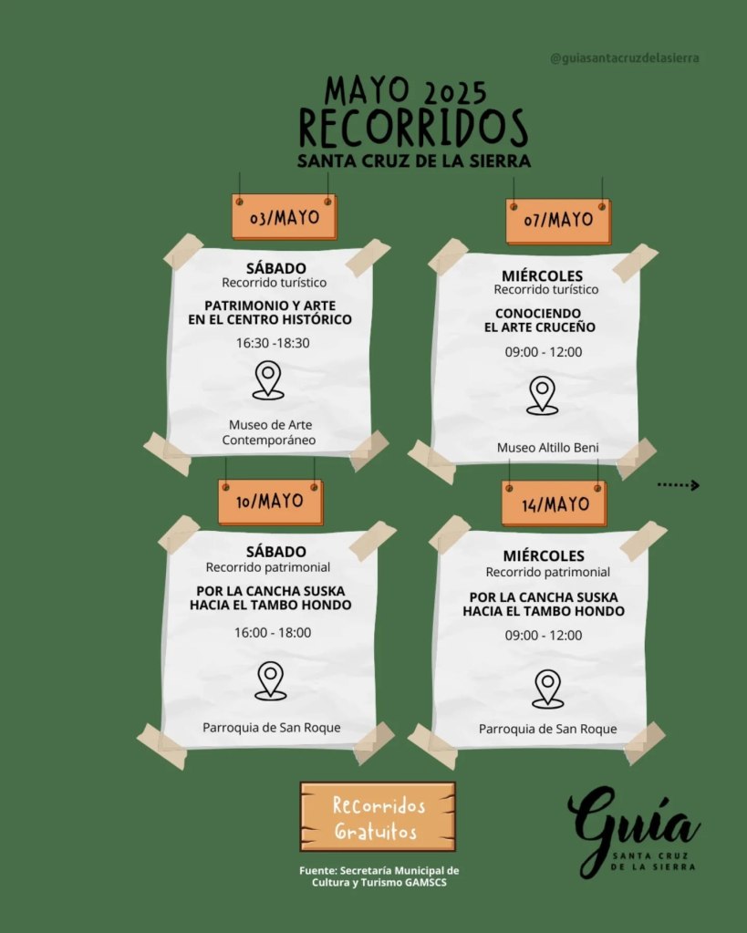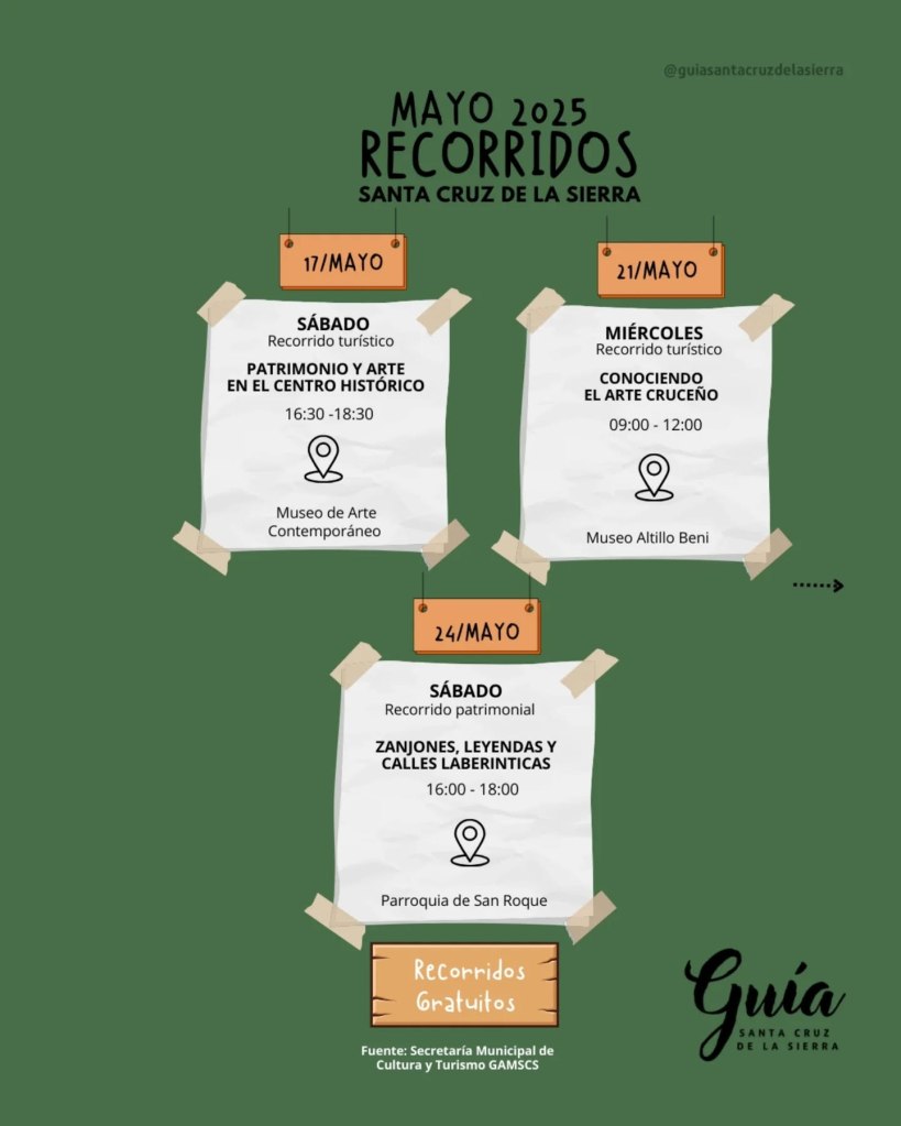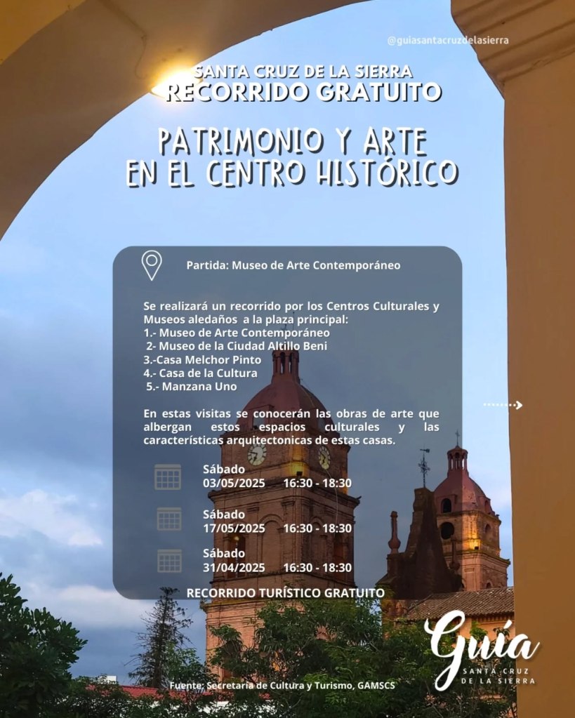 Si sos de Santa Cruz de la Sierra y querés aprender de su historia, sus calles y sus atractivos turísticos, tenés que seguir la agenda de los recorridos gratuitos turísticos y patrimoniales en el centro de la ciudad. Y si no lo sos, vivís en ella o estás de paso, quedás invitado igualmente a conocerlos.