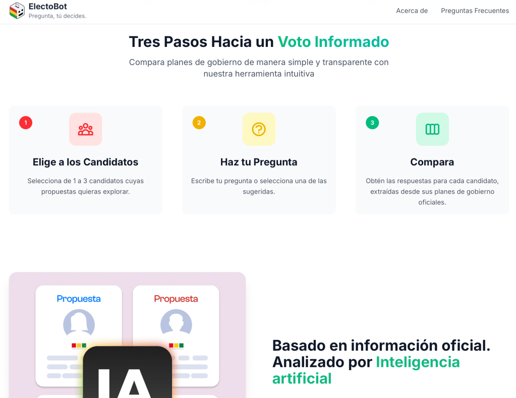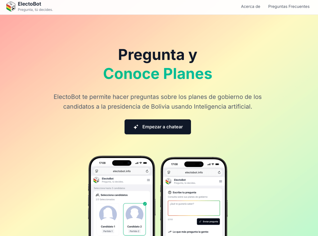 ElectoBot te permite hacer preguntas sobre los planes de gobierno de los candidatos a la presidencia de Bolivia usando Inteligencia artificial. Sugiere preguntas que cubren diversas áreas de la coyuntura boliviana, y además se adapta según las preguntas que uno realiza. Luego de algunas pruebas, verifiqué que no hay inducción al voto hacia ningún candidato.