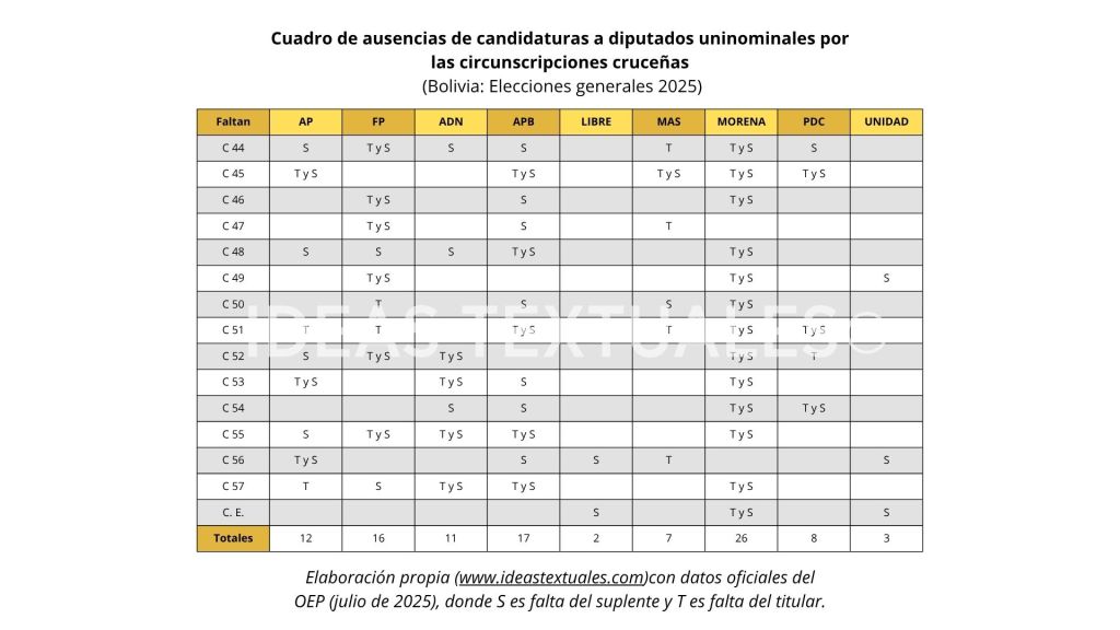 En Ideas Textuales, preparamos un cuadro de cada una de las 15 circunscripciones cruceñas con los candidatos uninominales titulares y suplentes de cada partido político o alianza que participan en estas elecciones, así como otro cuadro con las notables ausencias de listas completas de la mayoría de las fuerzas políticas que buscan representar al país y, en este caso, a Santa Cruz.
