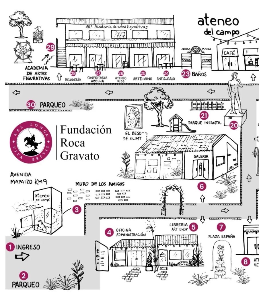 El «Ateneo del Campo» es una iniciativa del Dr. Luis Alberto Roca y su esposa la Sra Rita Gravato, quienes junto con sus hijos, amigos y artistas construyeron un espacio totalmente dedicado al arte donde antes funcionaba el Colegio San José. Desde enero de 2020, pusieron en marcha la Academia de Artes Figurativas, un taller de dibujo, pintura y escultura abierto a todo aquel dispuesto a aprender haciendo. Acogen, además, a talentos que vienen de las provincias cruceñas y del resto del país. En el «Ateneo del Campo», media jornada es insuficiente para recorrer las bibliotecas, las exposiciones de obras de arte permanentes y temporales, la librería y tienda de arte (sucursal de la tradicional librería «Ateneo», ubicada en el centro comercial Design Center), las plazuelas temáticas y el café «Alto Tostado» (originalmente también «Ateneo»), la tienda de dulces portugueses (Confetaria Abelha), el Muro de los Amigos. Se encuentra ubicado a la altura del Km. 9 de la Doble Vía a La Guardia, ingresando por la avenida Mapaizo y el ingreso tiene un costo de 10 bolivianos (poco más de un dólar).