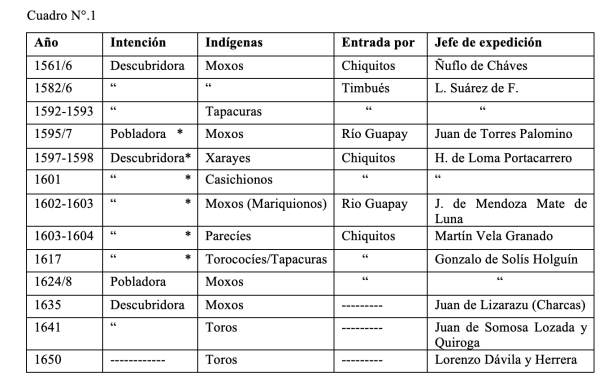 El siguiente cuadro, parcial, que refleja las entradas a los llanos de mojos con la intención de descubrir metales preciosos o poblar el territorio, muestra que en más de una ocasión dichas incursiones terminaron en “malocas”, es decir, se les hizo la guerra a los indigenas con el fin de vencerlos y tomarlos como “piezas”, esto es, serían sometidos para el servicio en las casas de los hispanos o cruceños.